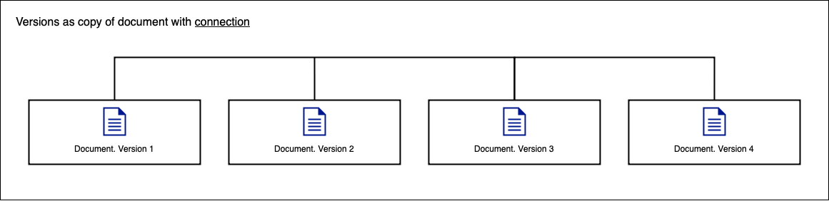 This model builds upon the "Versions as Copies" approach by introducing connections between the duplicated documents. When a user creates a new version, the system maintains a link to the previous version, enabling easier navigation and the ability to reflect changes across connected versions. However, this added functionality comes with increased complexity in handling corner cases and implementation.